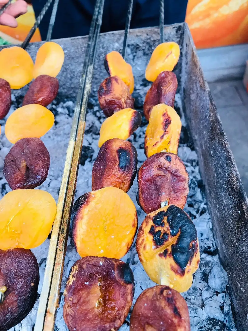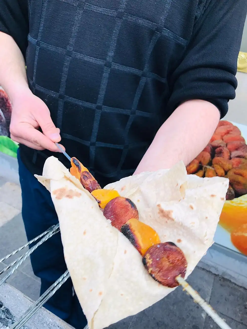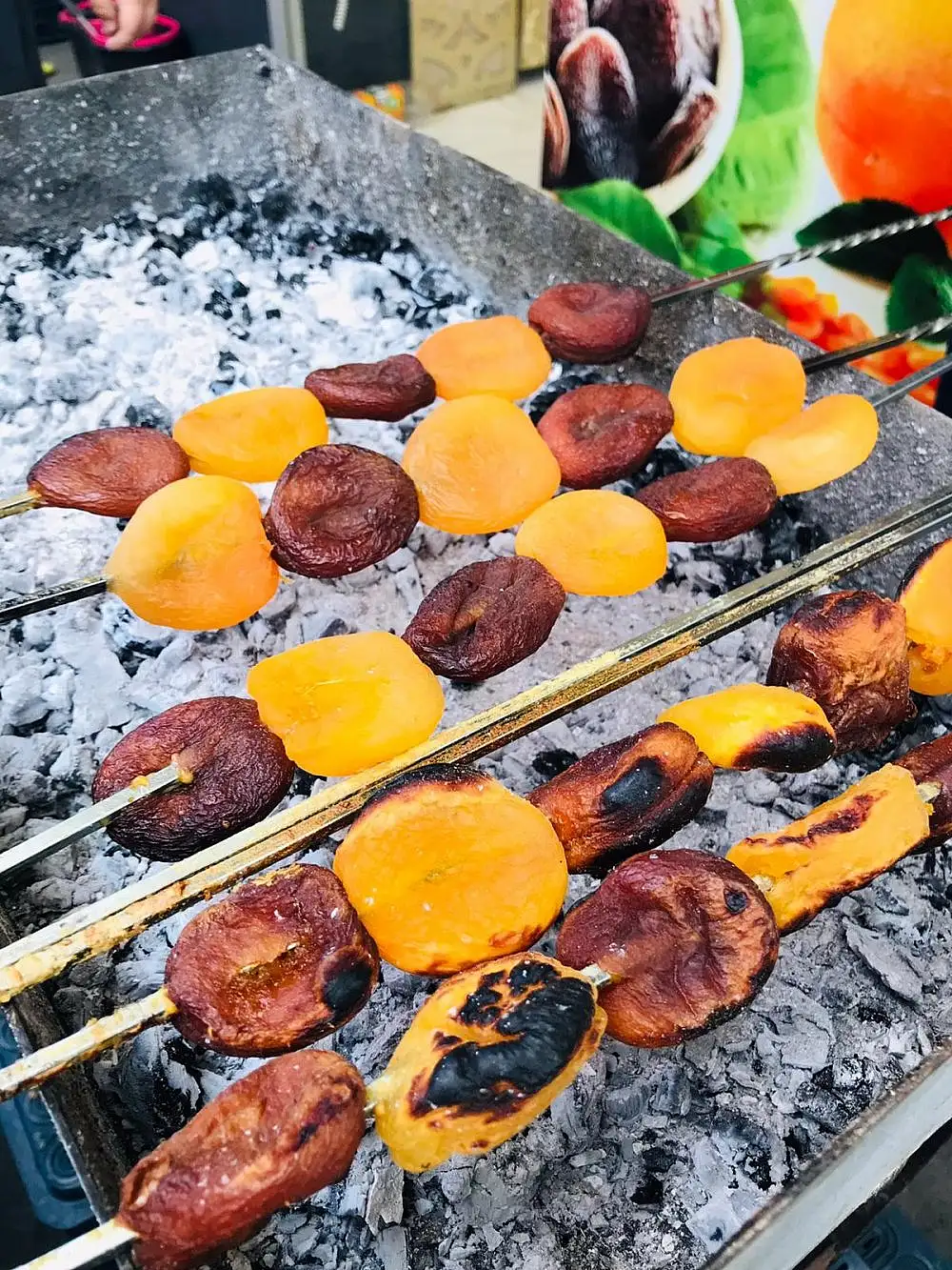 Kırmızı et veya tavuk etiyle birlikte kuşbaşı şeklinde kuru kayısı şişlere takılarak ateşte, mangalda kebap gibi kızartılıp ikram ediliyor. Ayrıca, kuru kayısılar şişe takılıp da kebap gibi kızartılarak da yenilebiliyor.