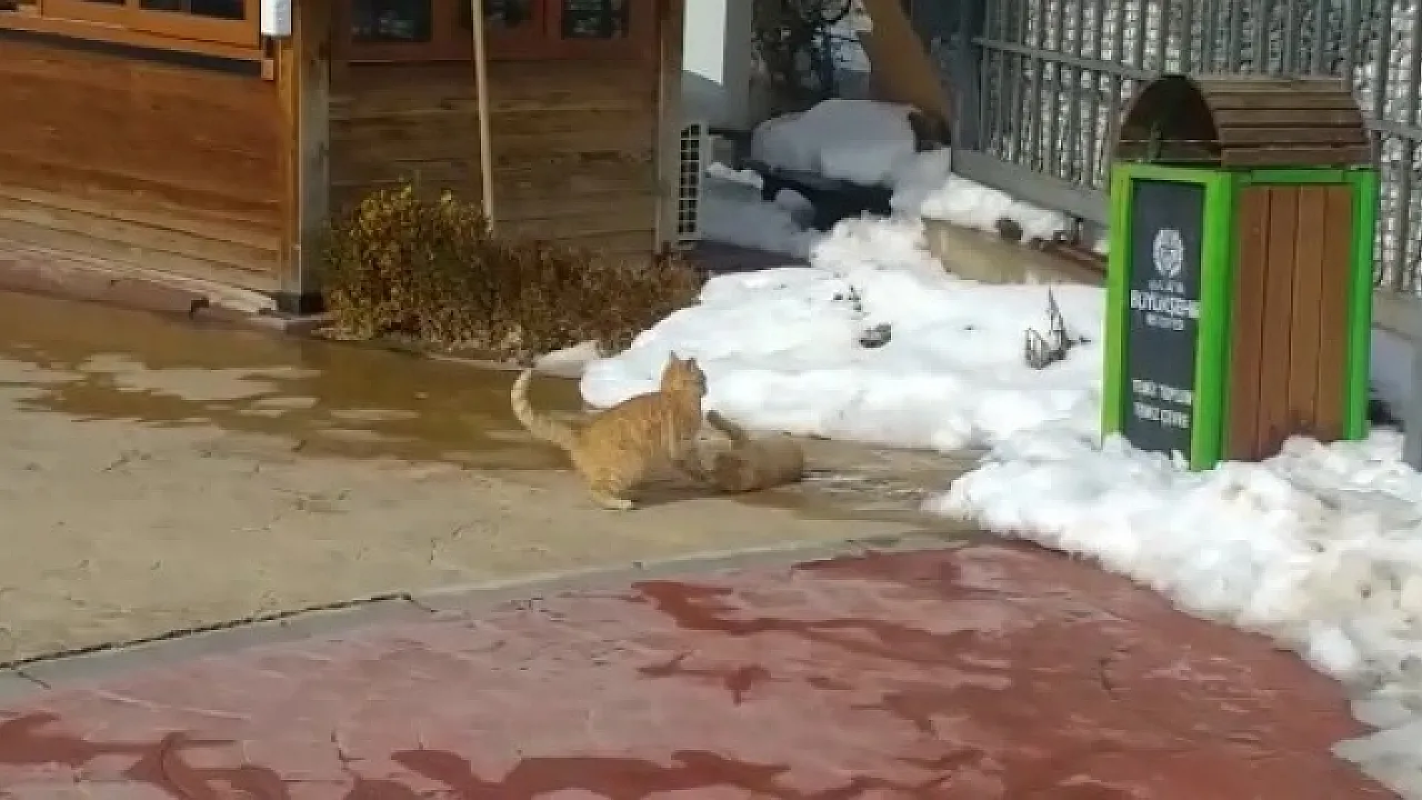 Malatya’da bir süredir etkili olan kar yağışı yerini güneşli havaya bıraktı. Hava sıcaklığın 5-6 derece hissedildiği kentte vatandaşlar kendini dışarı atarken, Malatya Büyükşehir Belediyesi Hayvanat Bahçesi yerleşkesinde güzel havayı fırsat bilen iki sokak kedisi ise oyun oynayarak güneşli havanın tadını çıkardı.