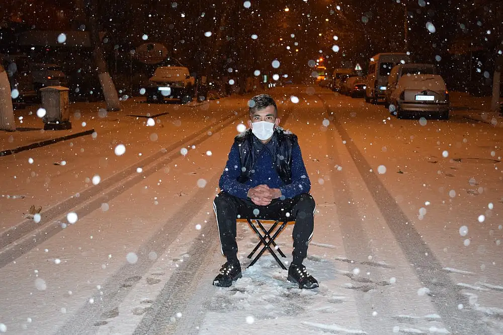 Sivas Caddesi'nde Taner Polat isimli bir genç yol ortasına koyduğu tabureden karı izlemeyi tercih ederek bol bol fotoğraf çektirdi.