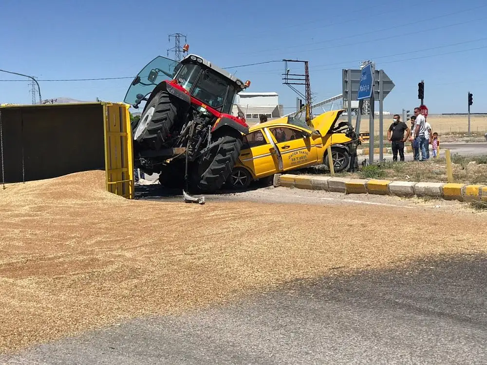 Sivas’ın Kangal ilçesinde traktörle, otomobilin çarpıştığı trafik kazasında 3 kişi yaralanırken traktör römorkunda bulunan 10 ton buğday Sivas-Malatya karayolunu trafiğe kapattı.