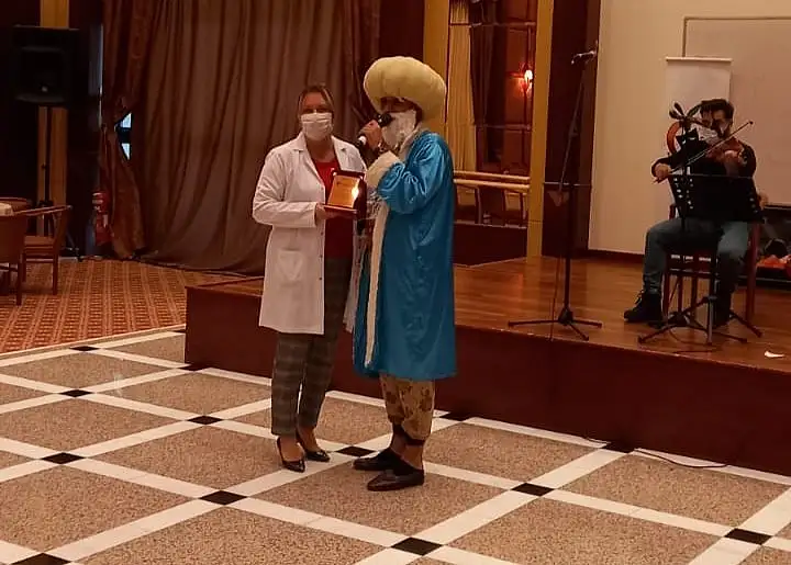 Etkinlik sonunda Başhekim Yardımcısı Burcu Kaya, Altın Kayısı Sanat Topluluğu Kurucusu tiyatro oyuncusu İbrahim Şahin Uyumaz'a teşekkür plaketi takdim etti.