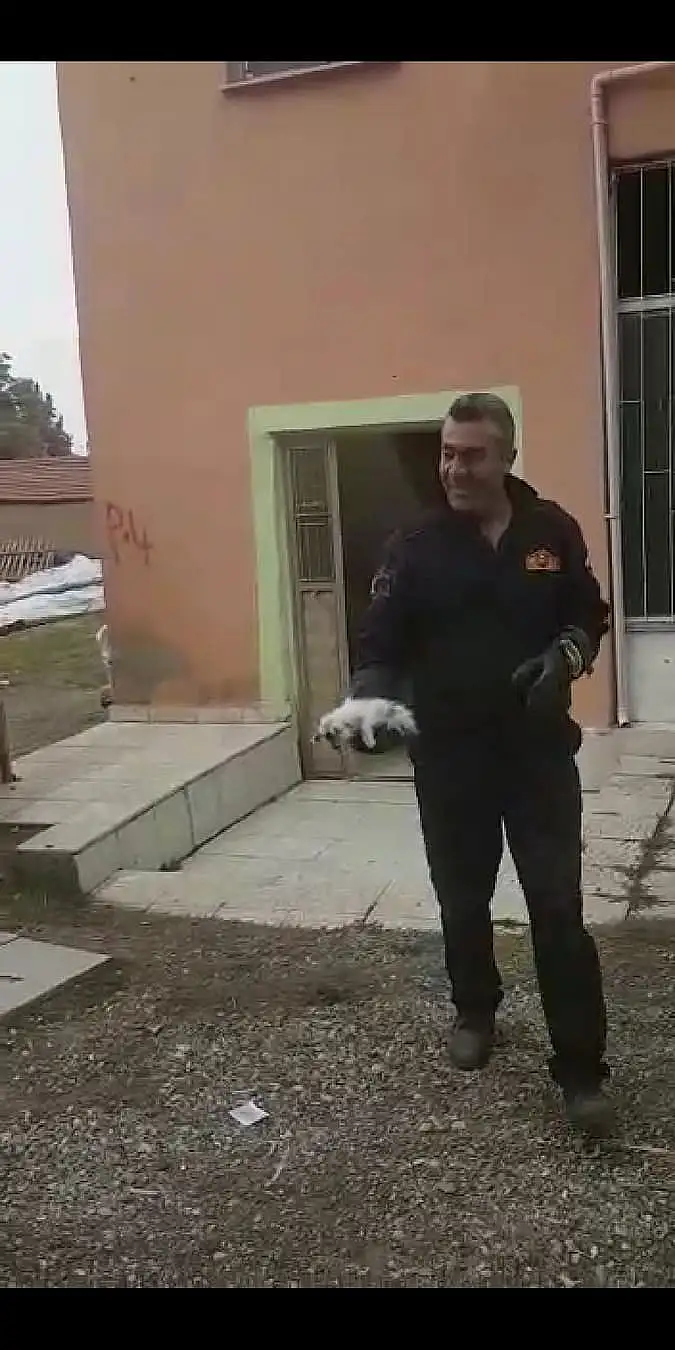 Mahsur kalan kedi, yeniden özgürlüğüne kavuşturulurken, mahalle halkı itfaiye erlerine teşekkür etti.