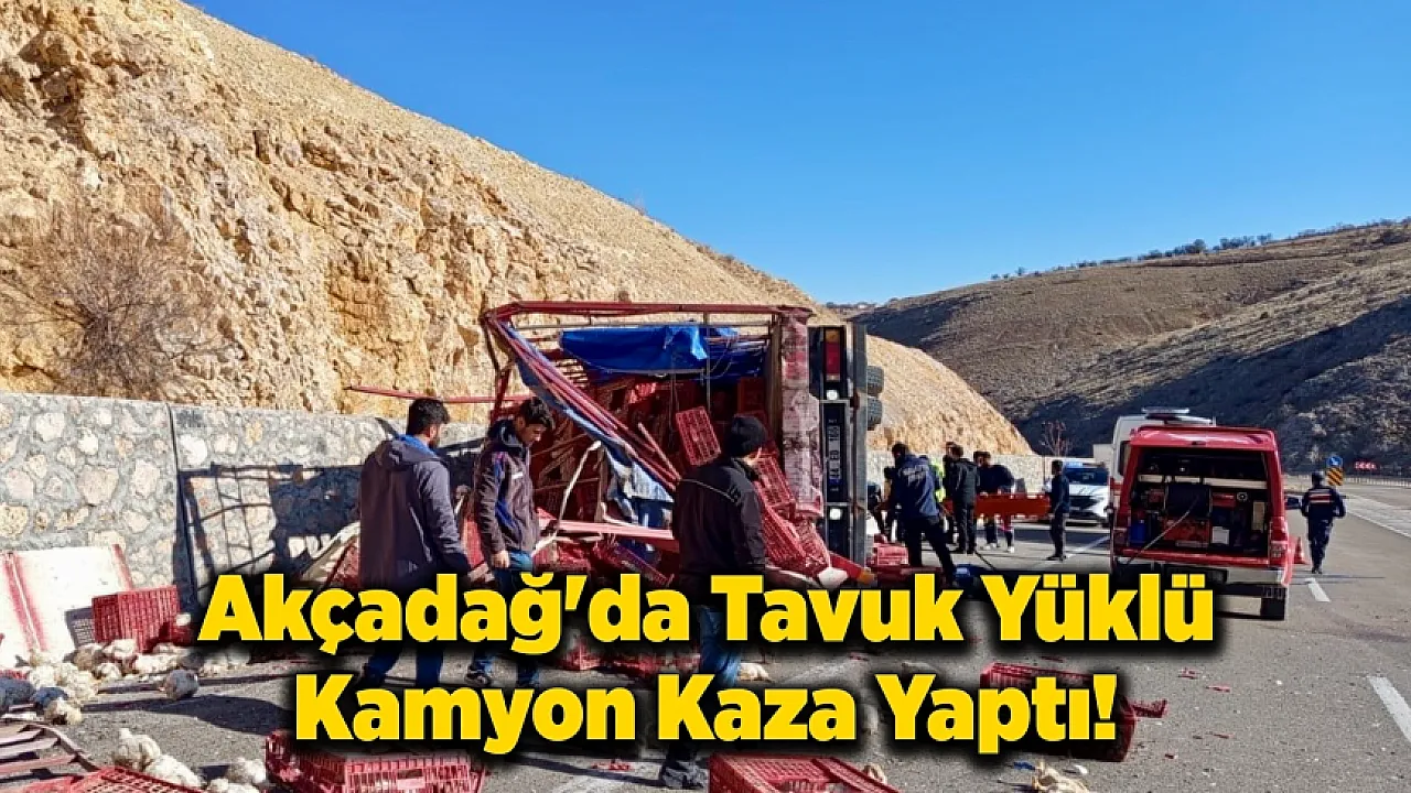 Akçadağ ilçesi Darende Karayolu üzerinde tavuk yüklü bir kamyonun devrilmesi sonucu meydana gelen trafik kazasında sürücü yaralandı. Kazada, kamyon kasasında bulunan yüzlerce tavuk telef olurken, yol ve çevrede geniş çaplı temizlik çalışması başlatıldı.