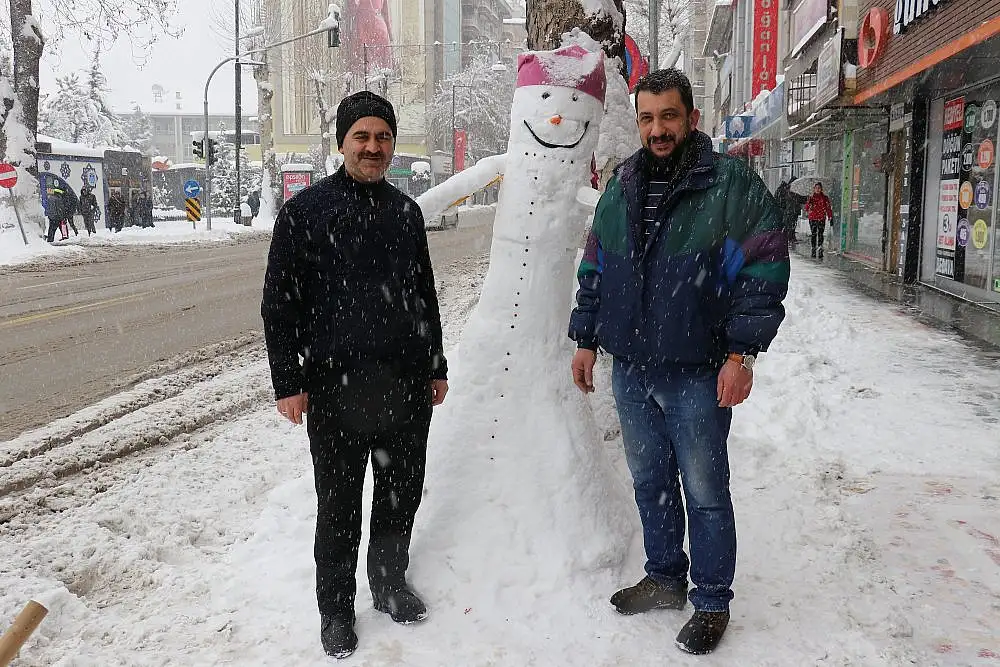 Kent merkezinde ise bazı esnaflar hem dükkanlarının önünü temizledi hem de bu anı eğlenceye dönüştürerek kardan adam yaptı.