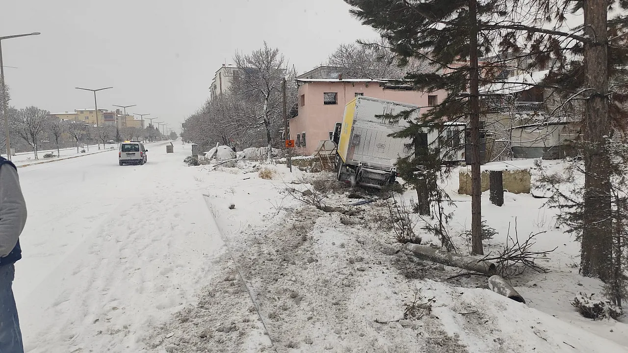 Edinilen bilgilere göre, karla kaplı ve buzlanmış zeminde yol alan kargo aracı, sürücüsünün direksiyon hâkimiyetini yitirmesi sonucu savruldu. Yolun kayganlaşmasıyla duramayan araç, güzergâh dışına çıkarak durabildi.