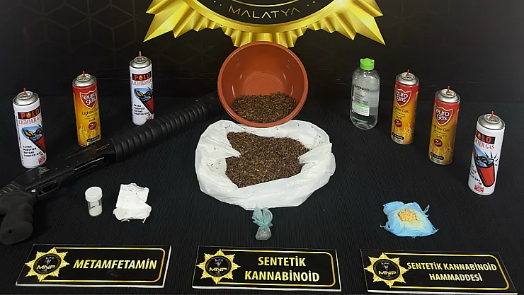 - • Malatya İl Emniyet Müdürlüğü ekiplerince düzenlenen operasyonda, toplamda 600 gramın üzerinde sentetik uyuşturucu, yüze yakın hap ve bir ruhsatsız tüfek yakalandı.