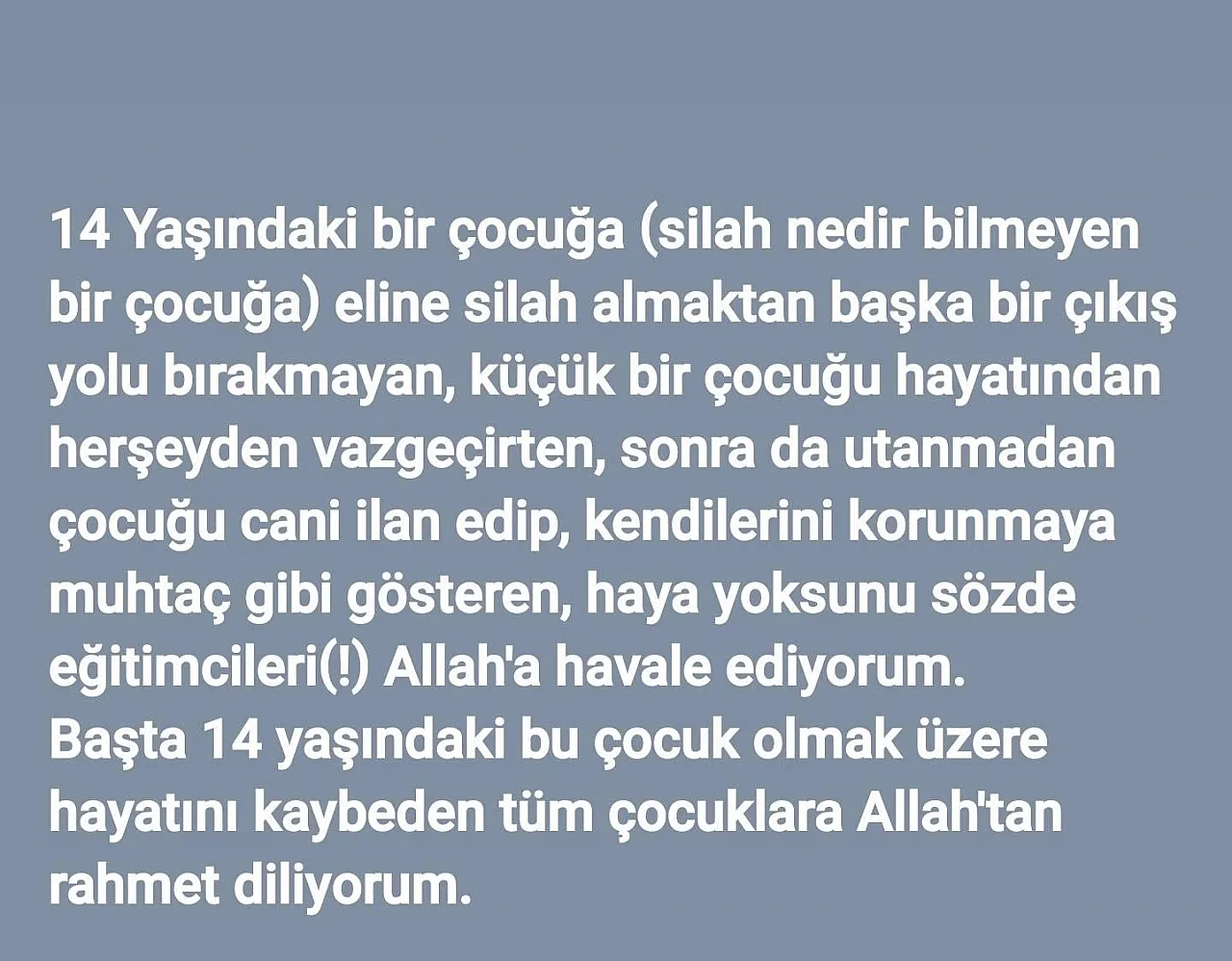 “14 yaşındaki bir çocuğa (silah nedir bilmeyen bir çocuğa) eline silah almaktan başka bir çıkış yolu bırakmayan, küçük bir çocuğu hayatından her şeyden vazgeçirten, sonra da utanmadan çocuğu cani ilan edip, kendilerini korunmaya muhtaç gibi gösteren, haya yoksunu sözde eğitimcileri(!) Allah'a havale ediyorum. Başta 14 yaşındaki bu çocuk olmak üzere hayatını kaybeden tüm çocuklara Allah'tan rahmet diliyorum.”