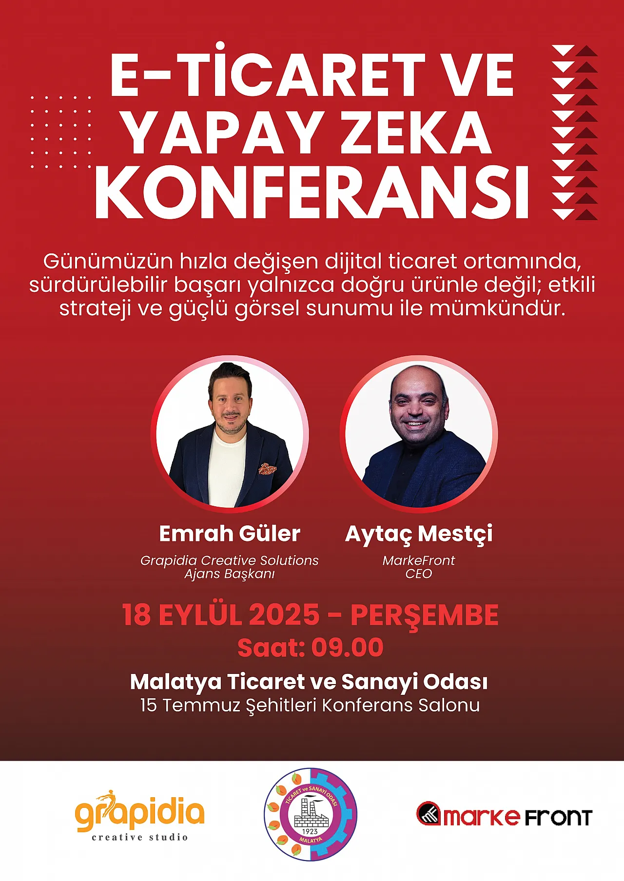 Malatya TSO binasında düzenlenecek olan konferansa, özellikle yapay zeka ve dijital ticaret alanına ilgi duyan herkes davet edildi. Etkinlik, bölgedeki işletmelerin dijital dönüşüm sürecine katkı sağlamayı ve yenilikçi fikirlerin paylaşımını hedefliyor.