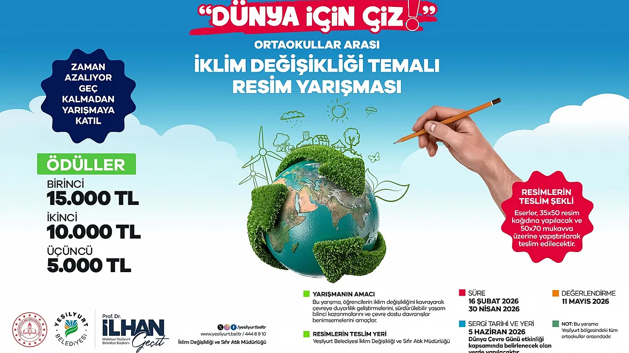 Yeşilyurt Belediyesi, çevre kirliliğiyle mücadele ve sürdürülebilir bir gelecek vizyonu doğrultusunda anlamlı bir sanatsal etkinliğe imza atıyor. İklim Değişikliği ve Sıfır Atık Müdürlüğü tarafından organize edilen 'Dünya İçin Çiz' temalı resim yarışması, ortaokul çağındaki gençlerin çevre bilincini sanatla harmanlamasına olanak tanıyor.