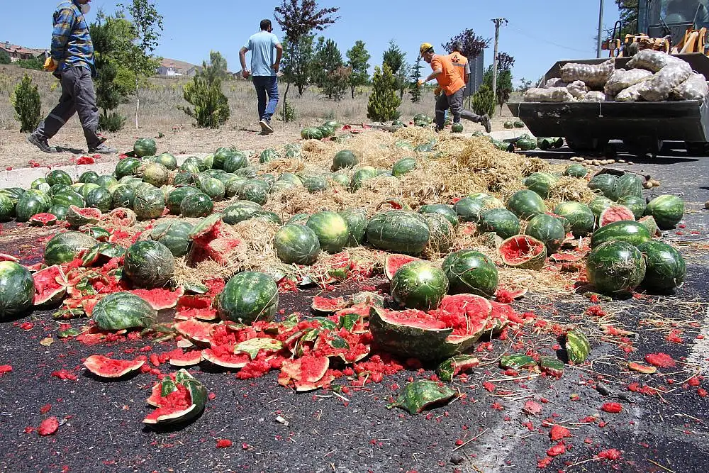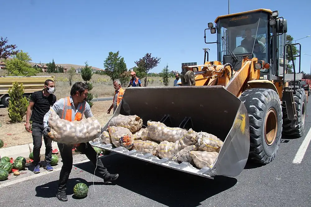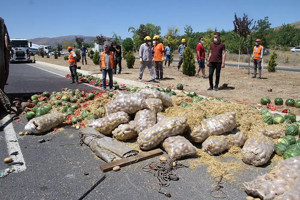 Malatya yolunda kamyon devrildi, patates ve karpuzlar yola saçıldı!