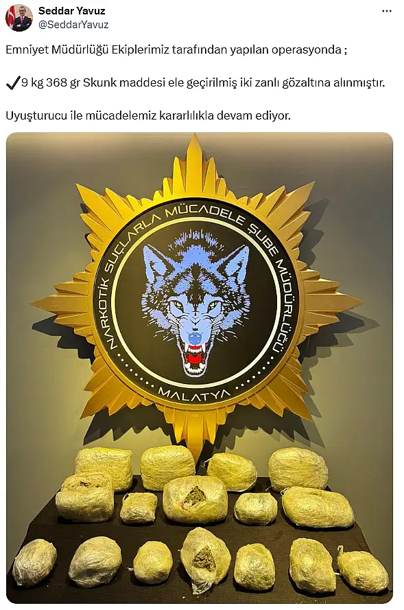 Seddar Yavuz, operasyonda 9 kilo 368 gram Skunk adlı uyuşturucu maddenin ele geçirildiğini ve 2 şüphelinin gözaltına alındığını bildirdi.