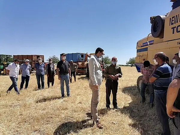 İlk hasadın yapıldığı Kağıt Fabrikası mevkindeki Buğday tarlasındaki çiftçileri, Kaymakam Hulusi Teke, Ziraat Odası Başkanı Süleyman Boyraz ile Tarım ve Orman Müdürlüğü Ziraat Mühendisleri ziyaret etti.