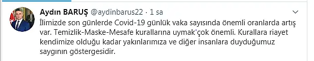 Baruş yaptığı paylaşımda, "İlimizde son günlerde Covid-19 günlük vaka sayısında önemli artış var. Temizlik, maske ve mesafe kuralalrına uymak çok önemli. Kurallara riayet kendimize olduğu kadar yakınlarımıza ve diğer insanlara duyduğumuz saygının göstergesidir." diye konuştu.