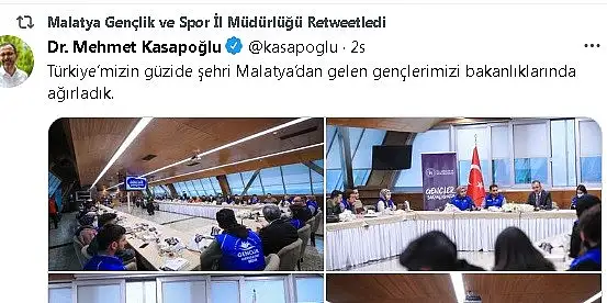 Bu arada, Gençlik ve Spor Bakanı Mehmet Kasapoğlu da sosyal medya hesabında yaptığı paylaşımda, “Türkiye’mizin güzide şehri Malatya’dan gelen gençlerimizi bakanlıklarında ağırladık” dedi.