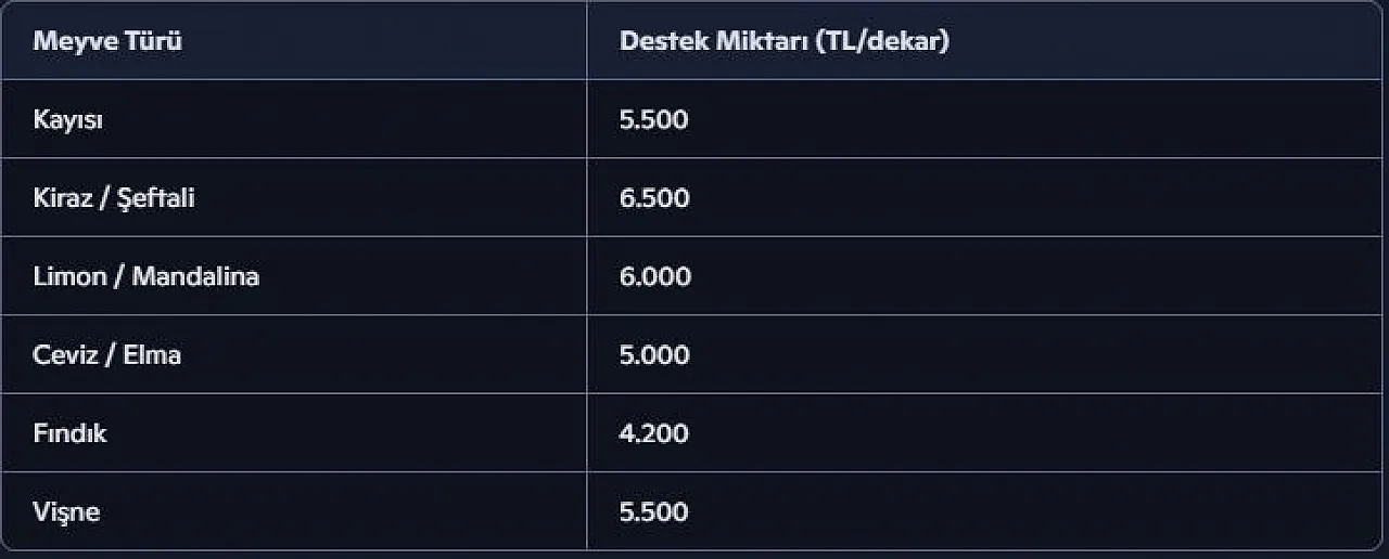 Malatya İl Tarım ve Orman Müdürlüğü yetkilileri, destekleme miktarlarının ürün türüne göre belirlendiğini ifade etmişti. Yapılan açıklamada, “İlimizin en önemli tarımsal ürünü olan kayısı için dekar başına 5.500 TL destekleme ödemesi yapılacaktır. Diğer meyve türleri için de ödeme miktarları hasar oranlarına göre belirlendi” denildi.