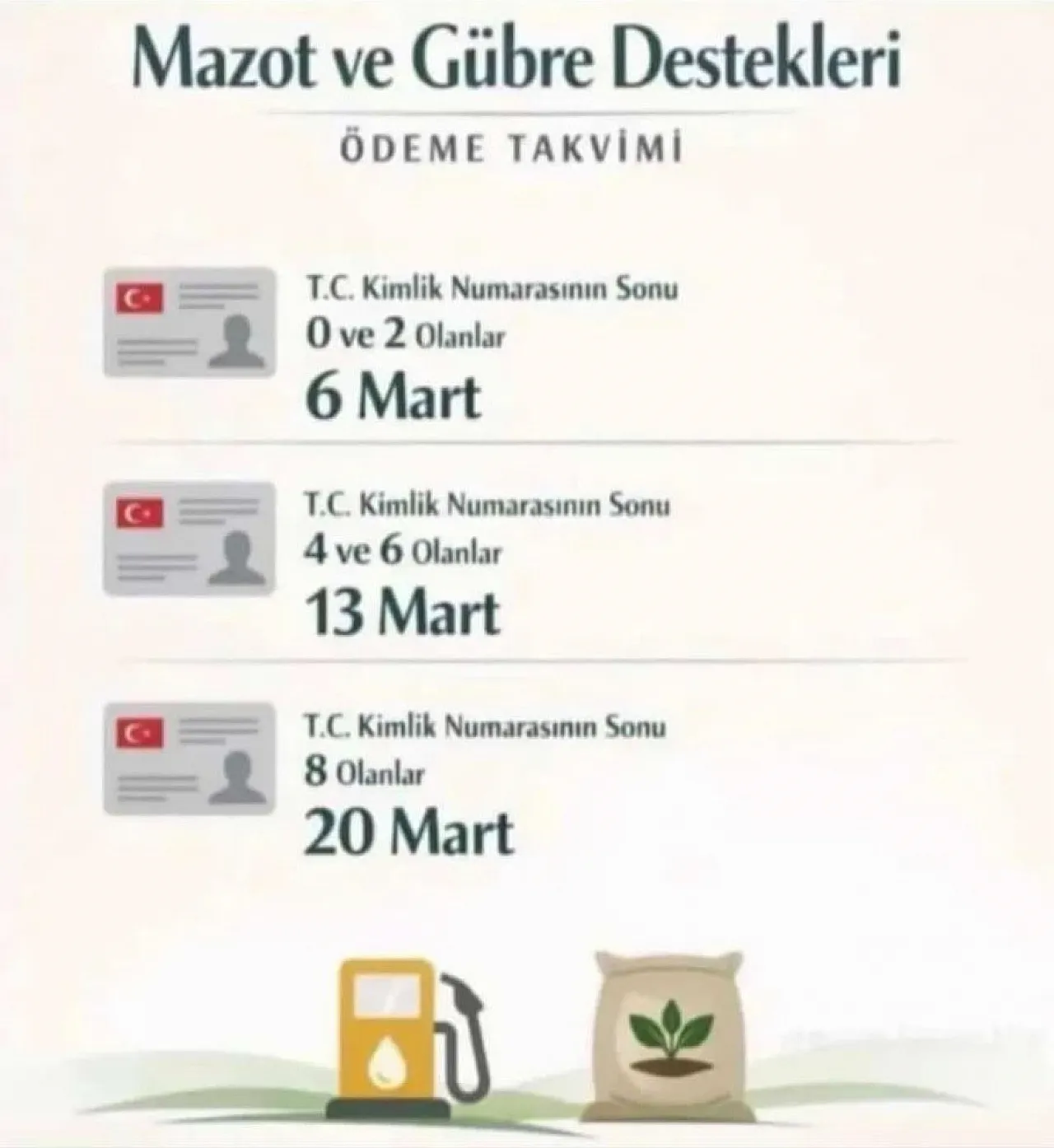 Bakanlık tarafından açıklanan takvime göre mazot ve gübre desteği ödemeleri 6 Mart 2026 tarihinde başlayacak. Ödemeler, önceki yıllarda olduğu gibi TC kimlik numarasının son hanesine göre kademeli şekilde yapılacak.