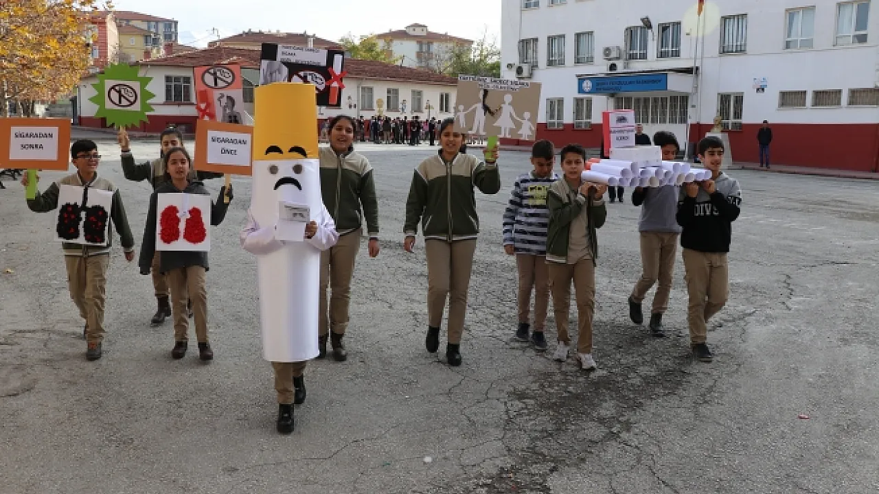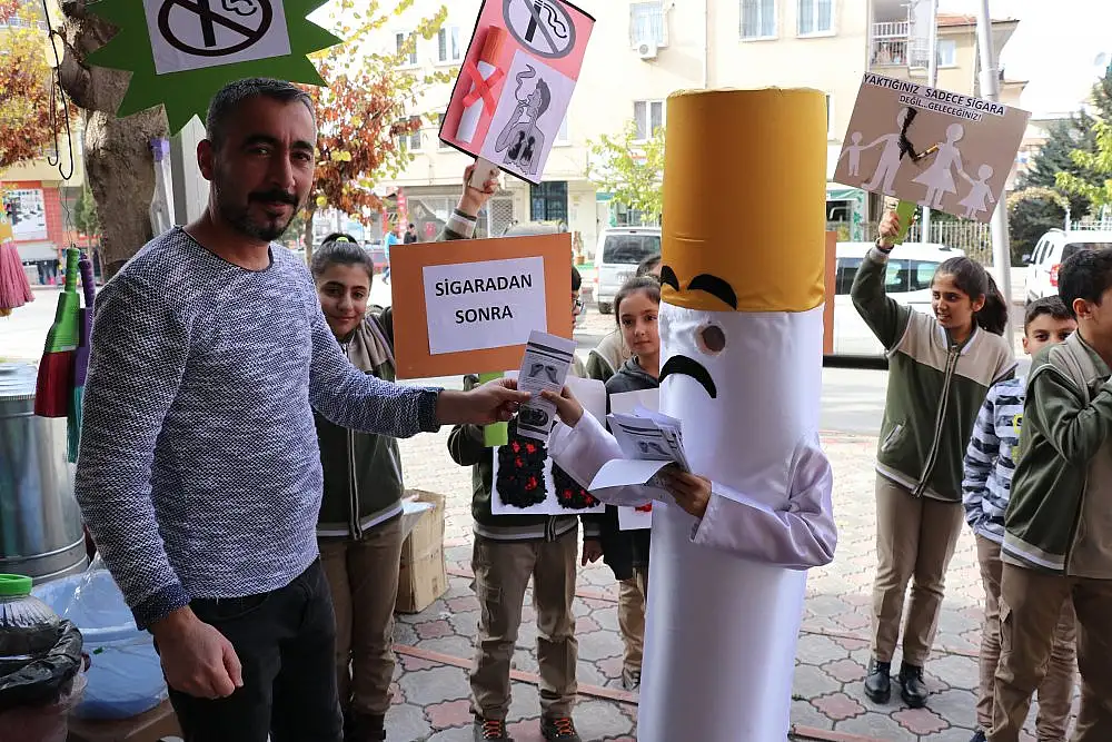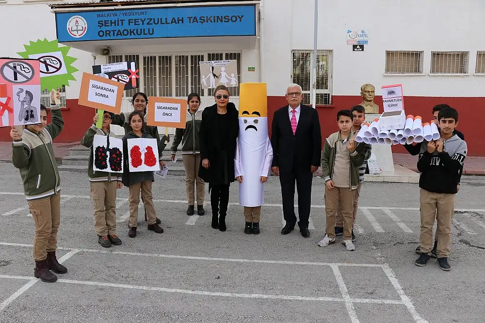 Malatya'da Feyzullah Taşkınsoy Ortaokulu öğrencileri sigaranın sağlığa zararlarına dikkat çekmek amacı ile yaptıkları etkinlikler ile vatandaşlara çağrıda bulundular.