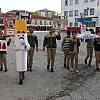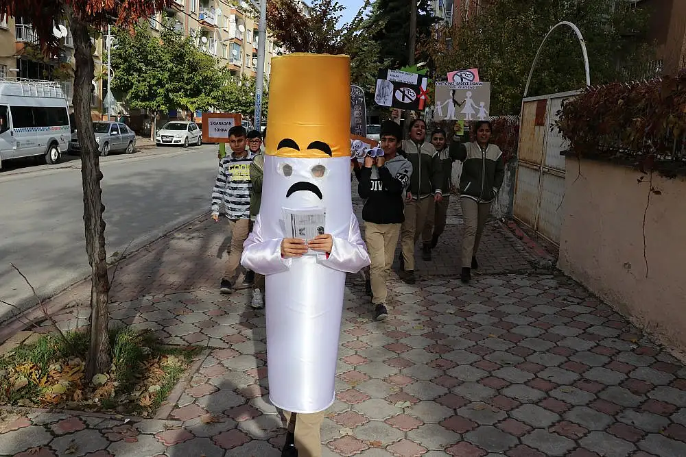 Feyzullah Taşkınsoy Ortaokulu önünde toplanarak, dikkat çeken kostümler giyen öğrenciler, yaptıkları maket tabut ve ellerinde pankartlar ile sigaranın sağlığa zararlarına dikkat çektiler.