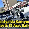 Edinilen bilgilere göre, sürücüsünün kimliği henüz öğrenilemeyen 44 AGC 632 plakalı hafriyat kamyonu, İsmet Paşa Caddesi üzerinde freni arızalanınca kontrolden çıktı. Kamyon, kırmızı ışıkta bekleyen ve yol kenarında park halinde bulunan 15 araca çarparak durabildi.