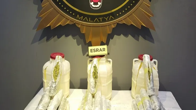 Malatya'da, yolcu otobüsünde peynir bidonlarına gizlenmiş vaziyette, 15 kilo 650 gram esrar ele geçirildi.