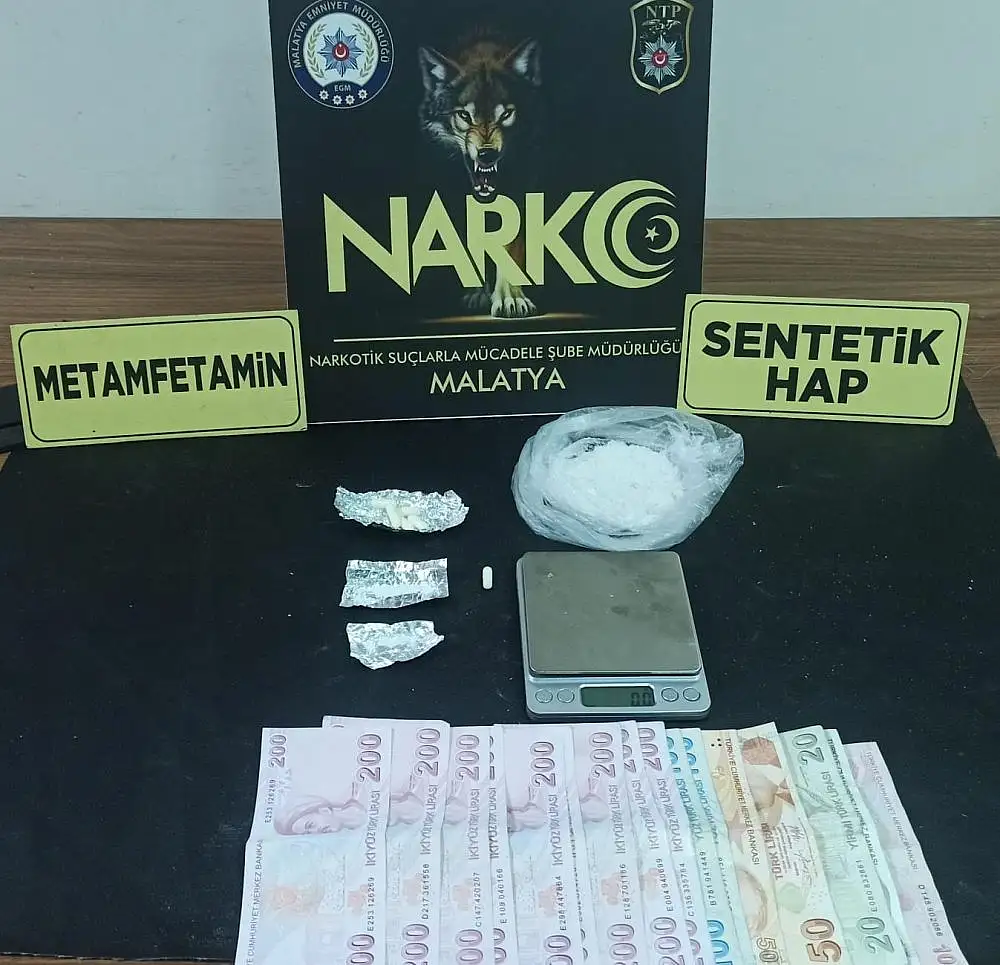 Malatya'da uyuşturucu ile mücadele çalışmalarını sürdüren polis ekipleri uyuşturucu ticareti yaptığı değerlendiren E .C .F. ile O.K.'yi yakalayarak gözaltına aldı. Şüphelilerin yapılan üst ve ikamet aramalarında 158 kök hint keneviri, 23 uyuşturucu hap, 64,29 gram uyuşturucu madde ile uyuşturucu madde ticaretinden elde edildiği değerlendirilen 2 bin 350 TL ele geçirildi.