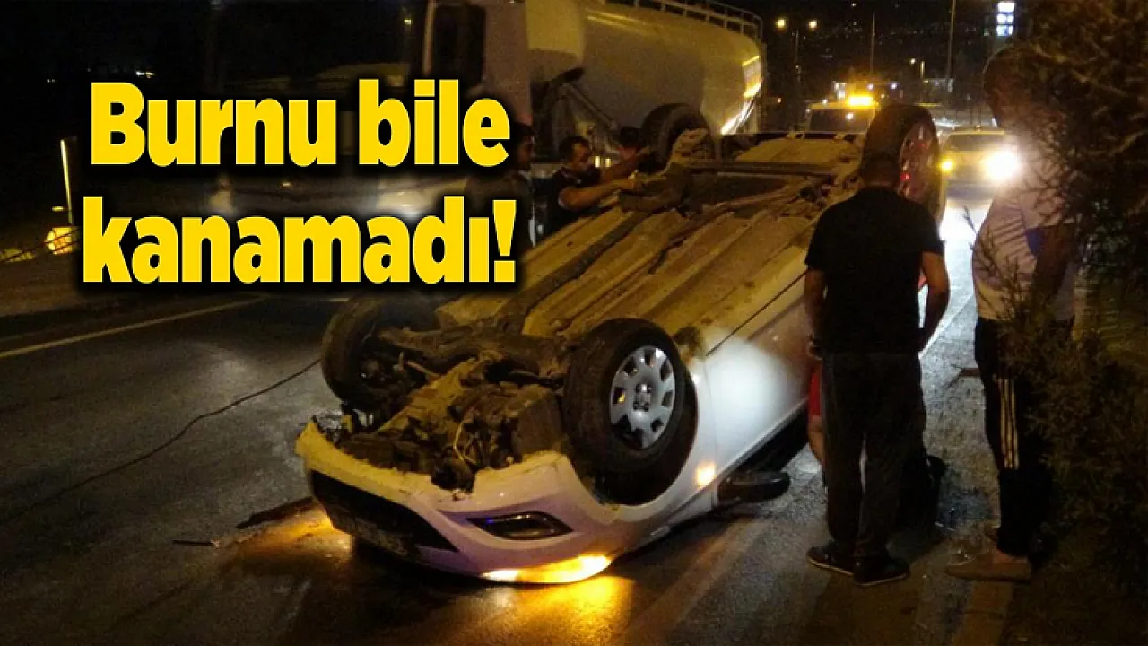Refüje çarparak ters dönen araçtan burnu kanamadan çıktı