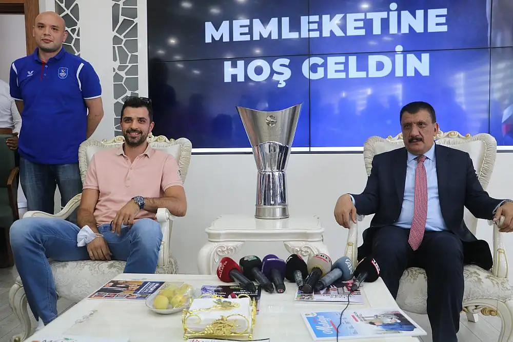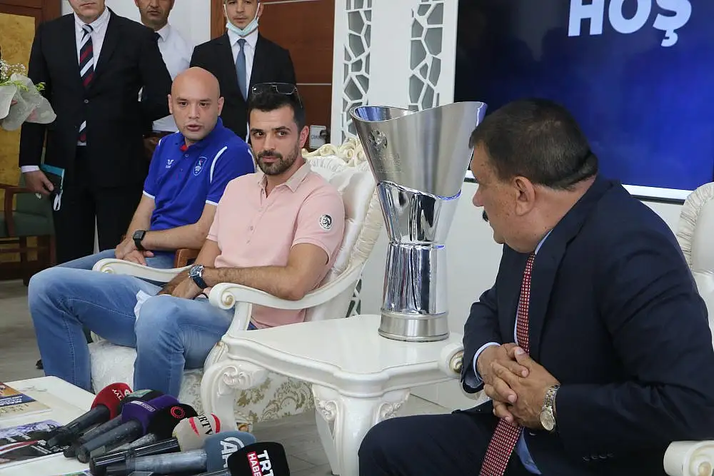 Konuşmaların ardından Başkan Gürkan, Simon’a çeşitli hediyeler taktim etti. Simon ise Başkan Gürkan’a Anadolu Efes takımının formasını hediye etti.