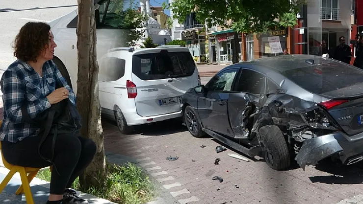 Malatya'da 4 aracın karıştığı trafik kazasında, araçlardan birinin sürücüsü olan kadın saniyelerle ölümden döndü. Büyük korku yaşayan ve şoka giren kadın, aracının yanında önce ayakta, sonra ise çevredeki vatandaşların getirdiği tabureye oturarak sessizce olan biteni izledi.