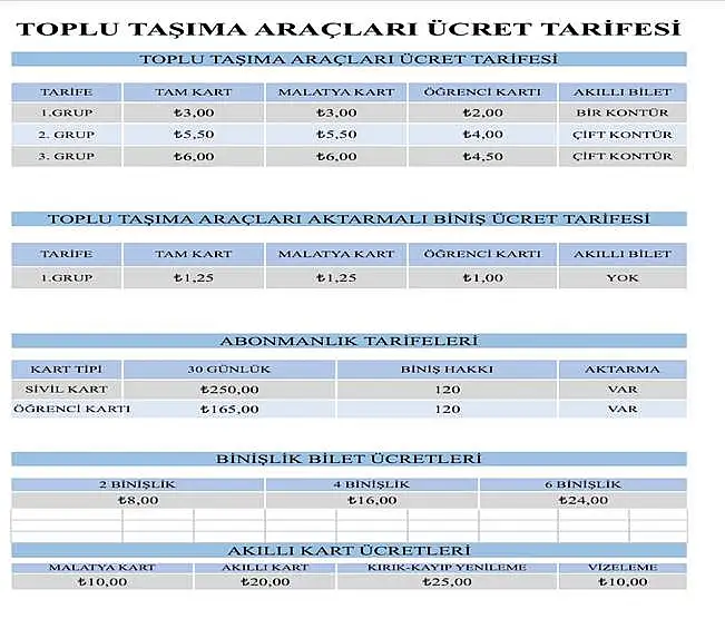 Malatya Büyükşehir Belediyesi Ulaşım Hizmetleri Dairesi Başkanlığının 29 Temmuz 2021 tarih ve 2021/80 sayılı UKOME Kararı doğrultusunda şehir içi toplu taşıma yapan araçların taşıma ücretlerinde güncellemeye gidildi.