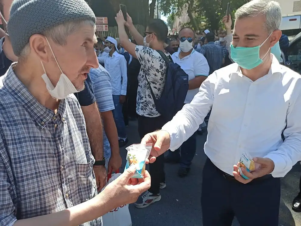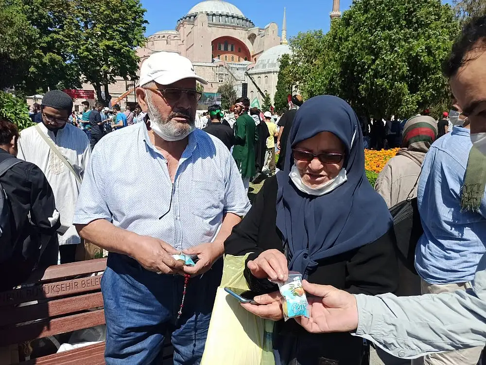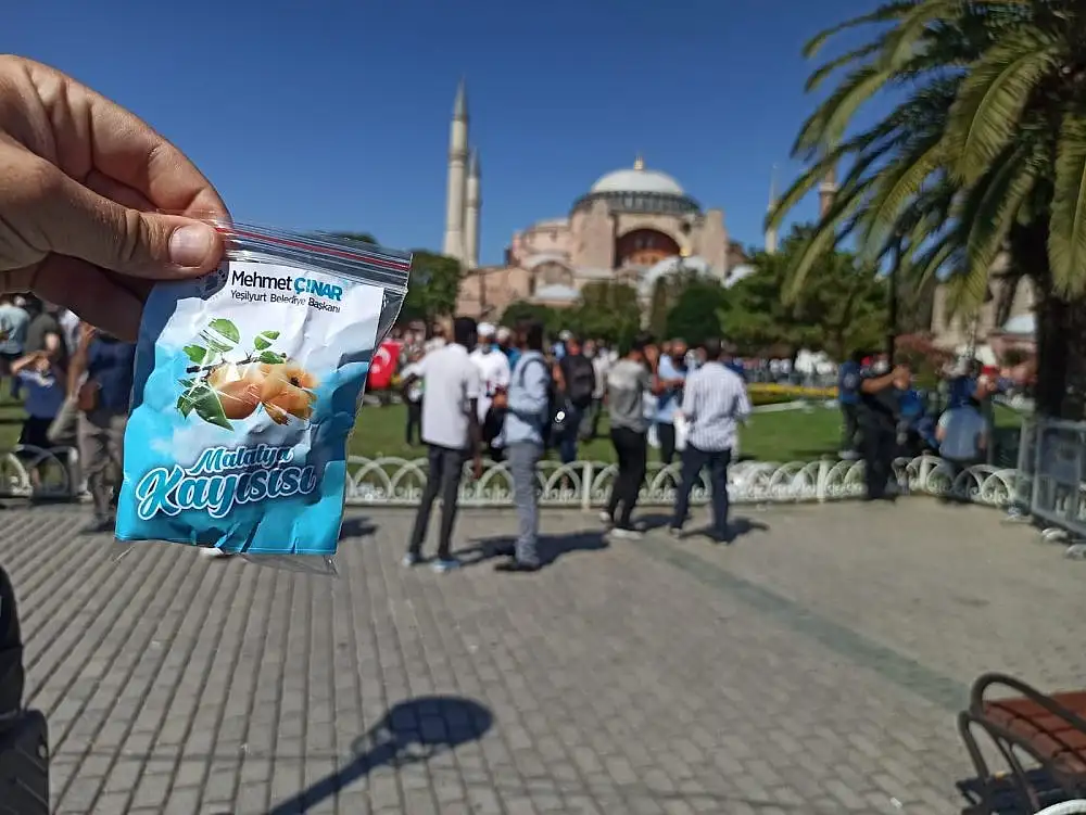 Malatya'nın Yeşilyurt Belediye Başkanı Mehmet Çınar, Cumhurbaşkanı Recep Tayyip Erdoğan'ın tarihi kararıyla 86 yıl aradan sonra ibadete açılan Ayasofya-i Kebir Cami-i Şerifi'nde kılınan Cuma Namazı sonrasında cemaate ve vatandaşlara Malatya Kayısısı ikram etti.