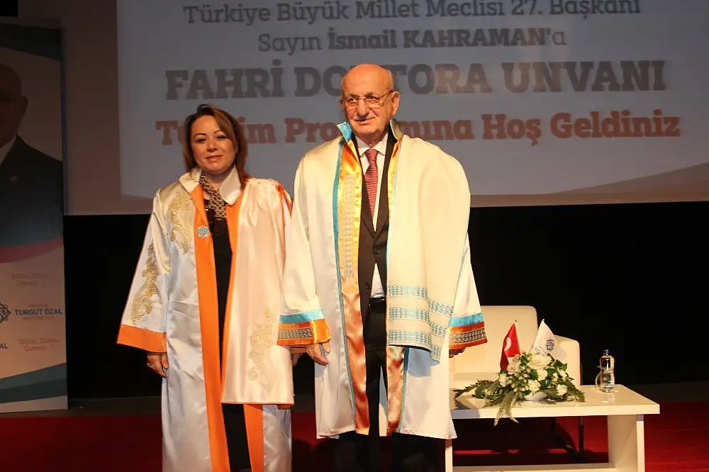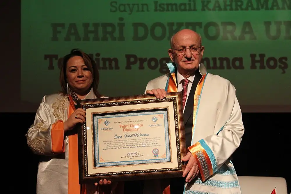Yapılan konuşmaların ardında Turgut Özal Üniversitesi Rektörü Prof. Dr. Aysun Bay Karabulut tarafında İsmail Kahraman’a Fahri Doktora Unvanı belgesi takdim edildi.