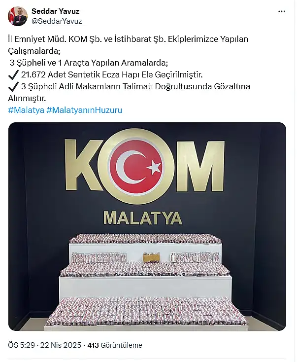 3 Şüpheli ve 1 araçta yapılan aramalarda 21.672 adet sentetik ecza hapı ele geçirildiği bilgisi verildi. Şüpheli şahıslar gözaltına alındı. Malatya Valisi Seddar Yavuz operasyona ilişkin sosyal medyada paylaşımda bulundu.