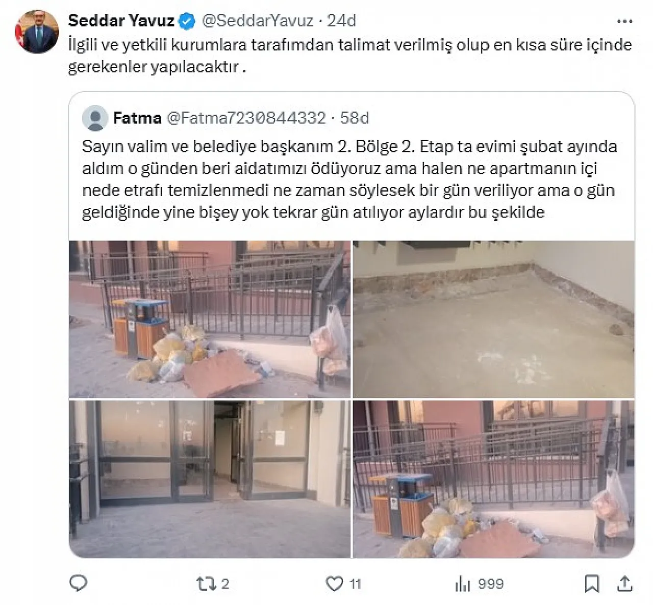 Vali Yavuz, bu şikâyete karşılık olarak, “İlgili ve yetkili kurumlara tarafımdan talimat verilmiş olup en kısa süre içinde gerekenler yapılacaktır” açıklamasında bulundu.