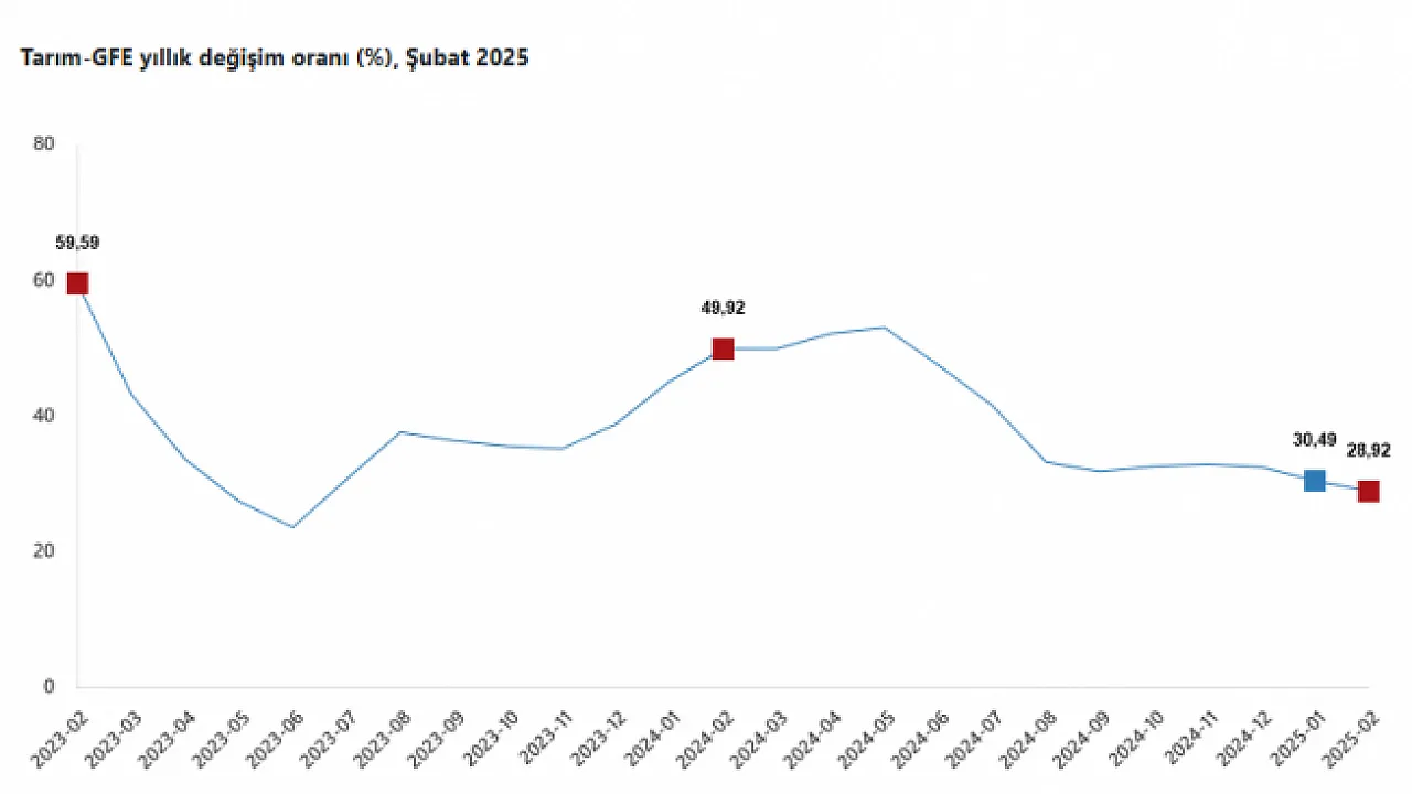 Buna göre, Tarım-GFE'de şubatta bir önceki aya göre yüzde 2,35 artış, bir önceki yılın aralık ayına göre yüzde 8,38 artış, bir önceki yılın aynı ayına göre yüzde 28,92 artış ve on iki aylık ortalamalara göre yüzde 37,78 artış gerçekleşti.