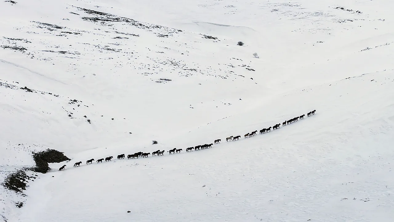 Doğal yaşam alanlarında toplu halde hareket eden yılkı atları, dağ ve vadiler arasında sürü düzenini koruyarak ilerliyor. Zorlu kış koşullarına rağmen birlik halinde hareket eden atlar, bölgenin doğal yapısı içinde yaşamlarını sürdürüyor.