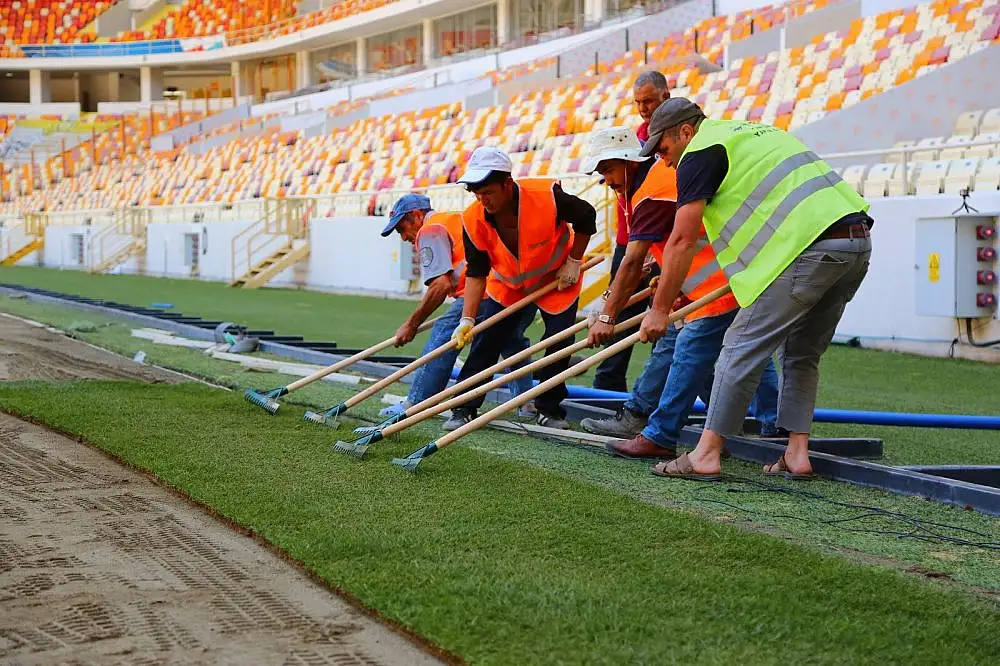 Süper Lig’in tamamlanması ile birlikte bakıma alınan Yeni Malatya Stadyumu’nda çalışmalar devam ediyor. Çim zemin değişikliğinin sürdüğü stadyumda çim serimi başladı.