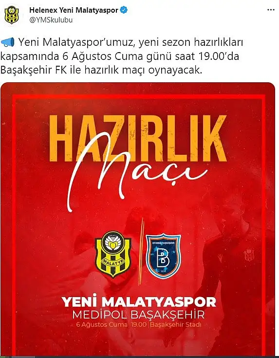 Söz konusu sosyal medya paylaşımında, “Yeni Malatyaspor’umuz, yeni sezon hazırlıkları kapsamında 6 Ağustos Cuma günü saat 19.00’da Başakşehir FK ile hazırlık maçı oynayacak” ifadelerine yer verildi.