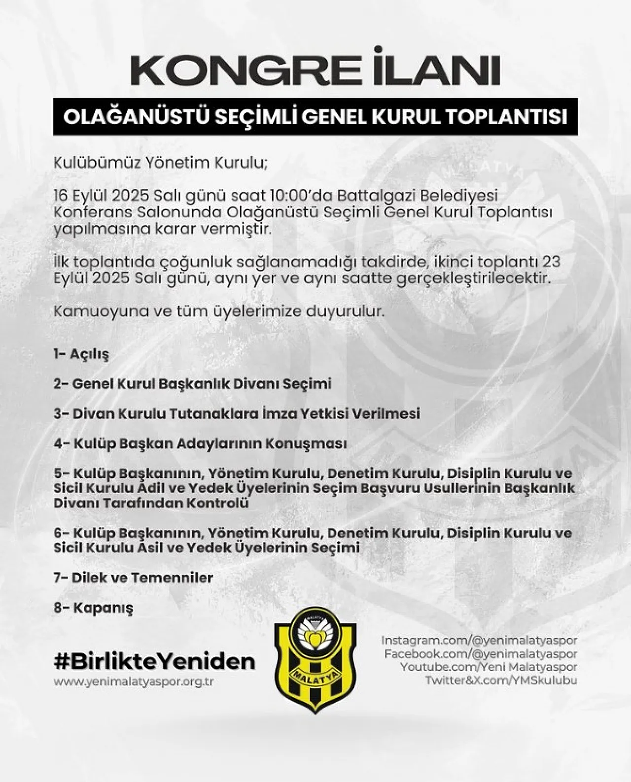 Yeni Malatyaspor Kulübü Derneği, olağanüstü seçimli genel kurul toplantısı için resmi çağrısını yaptı. Kulüp üyelerine yönelik yapılan duyuruda, toplantının 16 Eylül 2023 Cumartesi günü saat 10.00’da Battalgazi Belediyesi Konferans Salonu’nda gerçekleştirileceği bildirildi.