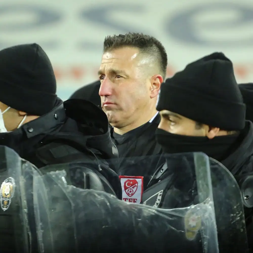 Çok sayıda polis ekibinin sahada önlem alması ile çevik kuvvet kalkanları altında sahadan çıkarılan hakemlere, bu sırada da taraftarlar pet şişe atarak tepki gösterdi.