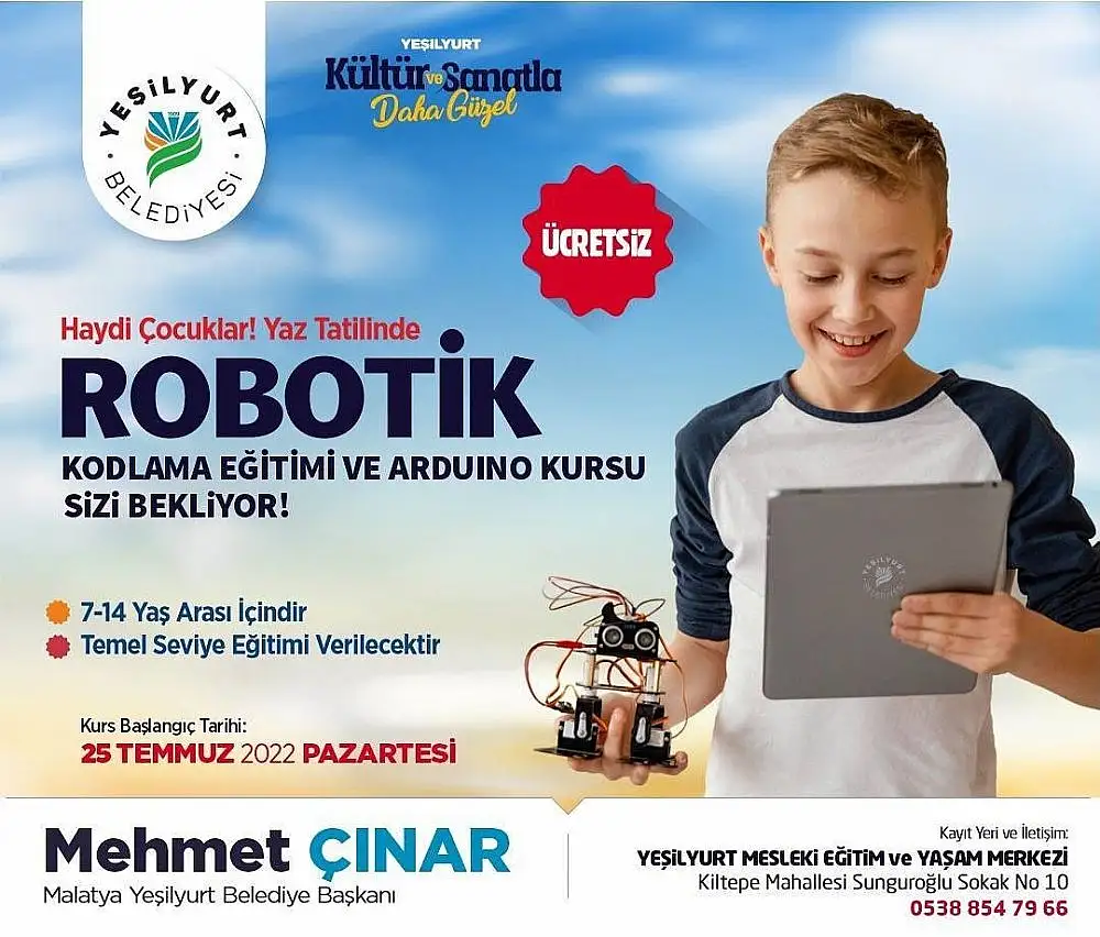 Malatya'nın Yeşilyurt Belediye Başkanı Mehmet Çınar teknoloji kursuyla ilgili açıklamasında, 'ཕ Temmuz'da Yeşilyurt Mesleki Eğitim ve Yaşam Merkezimizde açacağımız Robotik Kodlama Eğitimi ve Arduino Kursumuza 7 ile 14 yaş arasındaki bütün çocuklarımızı bekliyoruz' diye konuştu.