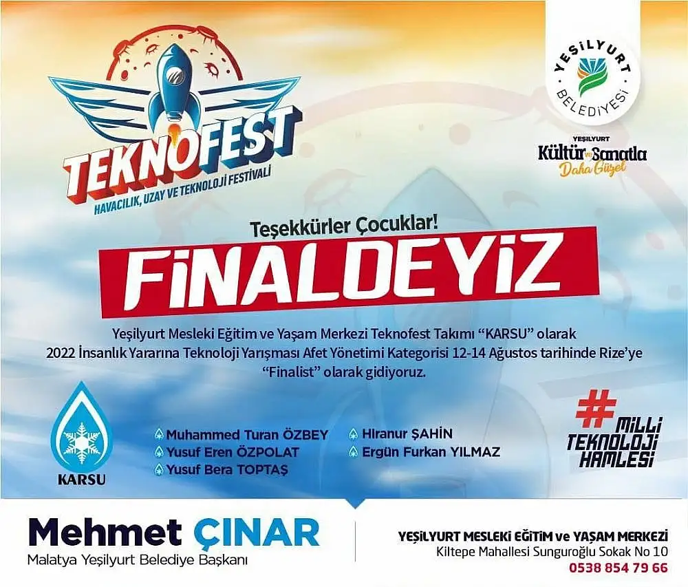 Yeşilyurt Belediyesinin destekleriyle kurulan takımların Türkiye’nin farklı kentlerinde düzenlenen TEKNOFEST Festivallerinde önemli başarılar elde ettiğini hatırlatan Çınar, Yeşilyurt Mesleki Eğitim ve Yaşam Merkezinde kurdukları TEKNOFEST ‘KARSU’ Takımının, 12 ile 14 Ağustos günleri arasında Rize’de yapılacak olan TEKNOFEST Havacılık, Uzay ve Teknoloji Festivalinin ‘2022 İnsanlık Yararına Teknoloji Yarışması Afet Yönetimi’ kategorisinde finale kaldığını ifade ederken, gençlere başarı dileklerini iletti.