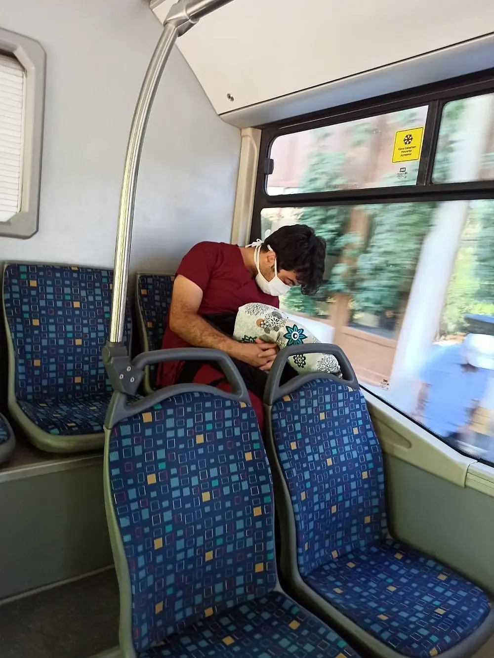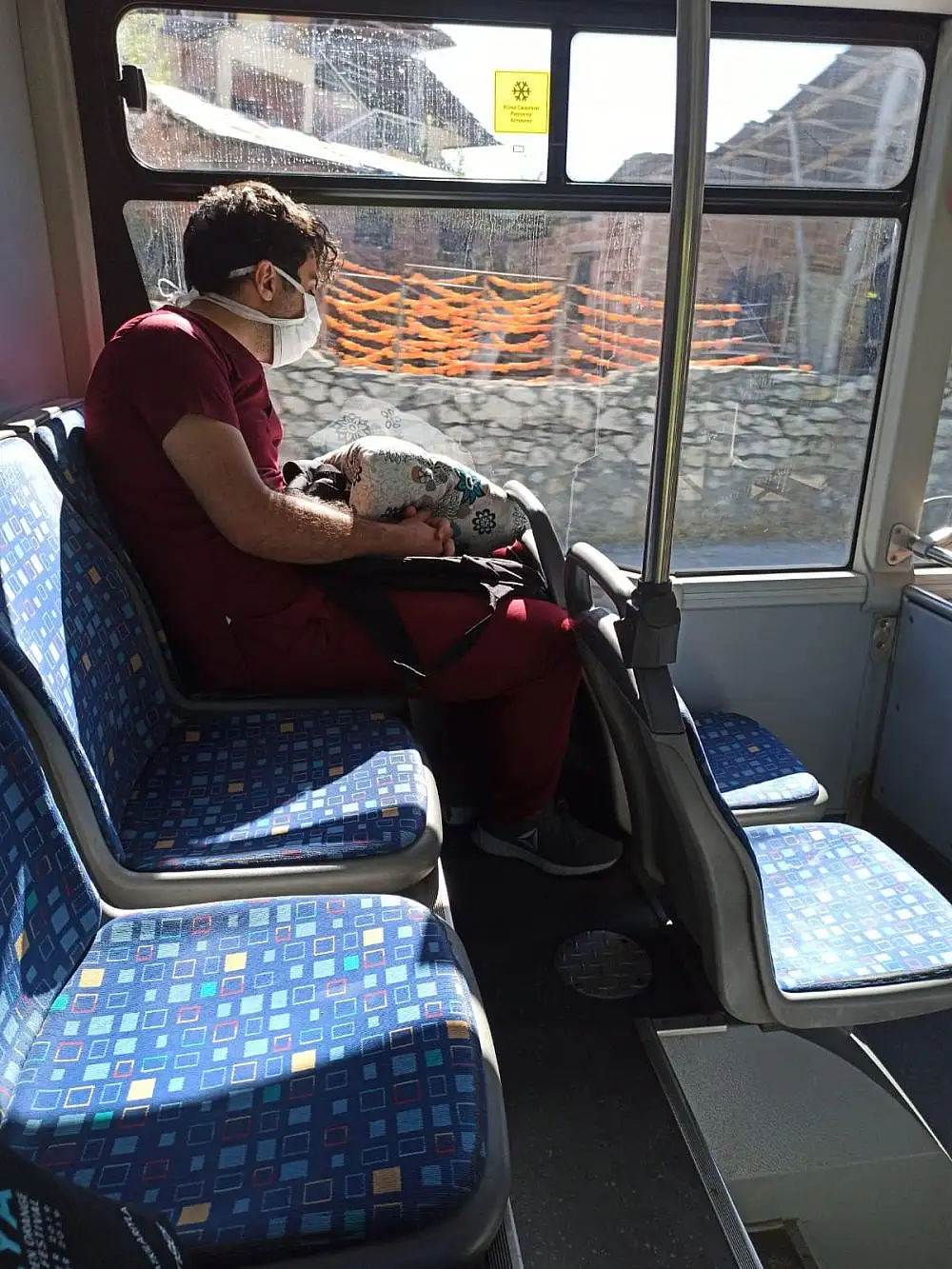 Yeni tip korona virüs (Covid-19) vakalarının son dönemde oldukça arttığı illerden biri olan Malatya’da, çalıştığı hastaneden nöbet sonrası eve giden bir sağlıkçının yoğun mesai sonrası otobüste uyuyakalması başka bir yolcu tarafından cep telefonu ile kaydedildi. Malatya Turgut Özal Tıp Merkezinde görev yaptığı öğrenilen Ensar Büyükkaya'nın uykuya yenik düştüğü anlar sosyal medyada büyük ilgi gördü.