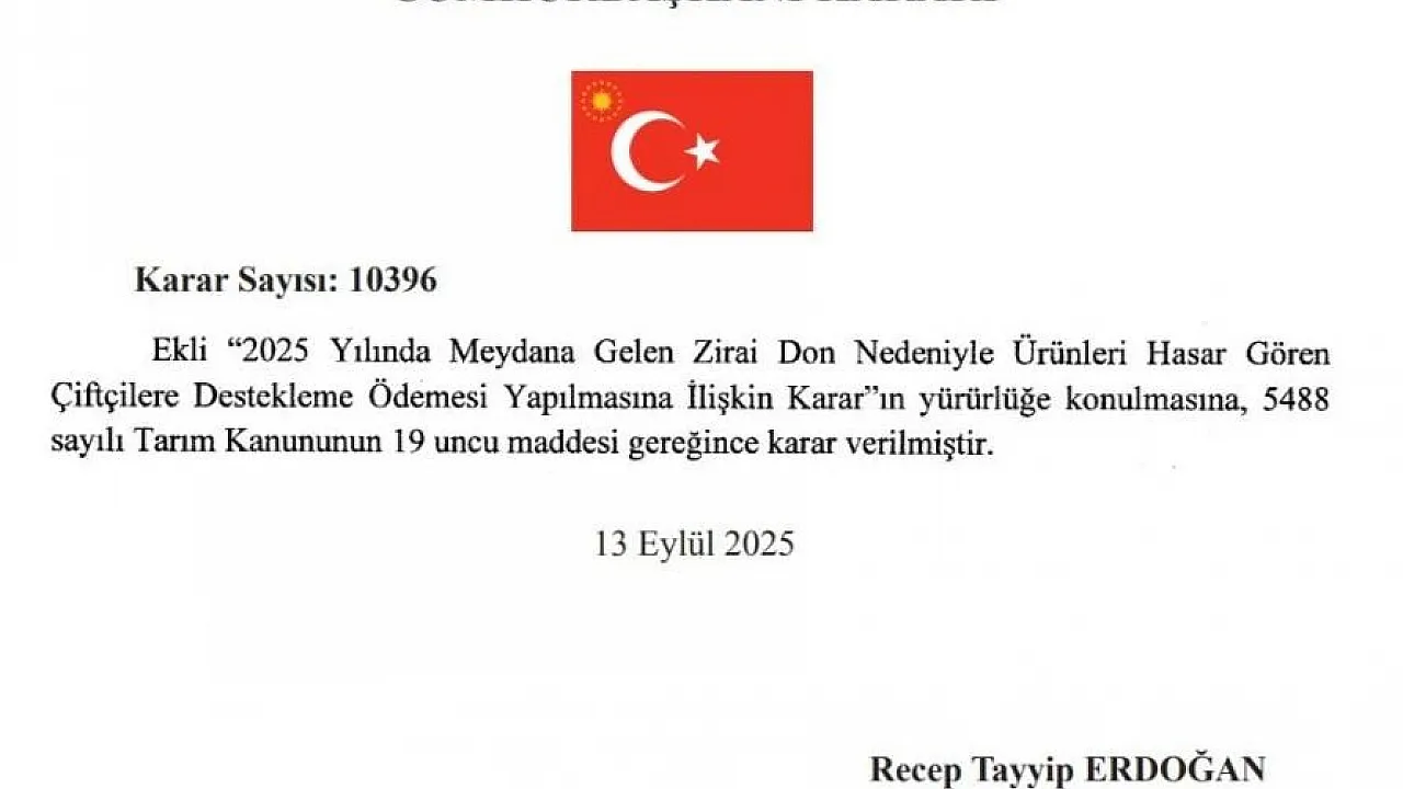 Cumhurbaşkanı Recep Tayyip Erdoğan'ın imzasıyla yayımlanan karar doğrultusunda, 2025 yılında meydana gelen zirai don nedeniyle ürünleri zarar gören çiftçilere destekleme ödemesi yapılacak. Karar, Resmi Gazete'nin 14 Eylül 2025 tarihli sayısında yayımlandı.